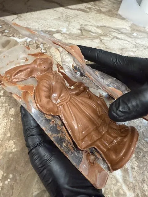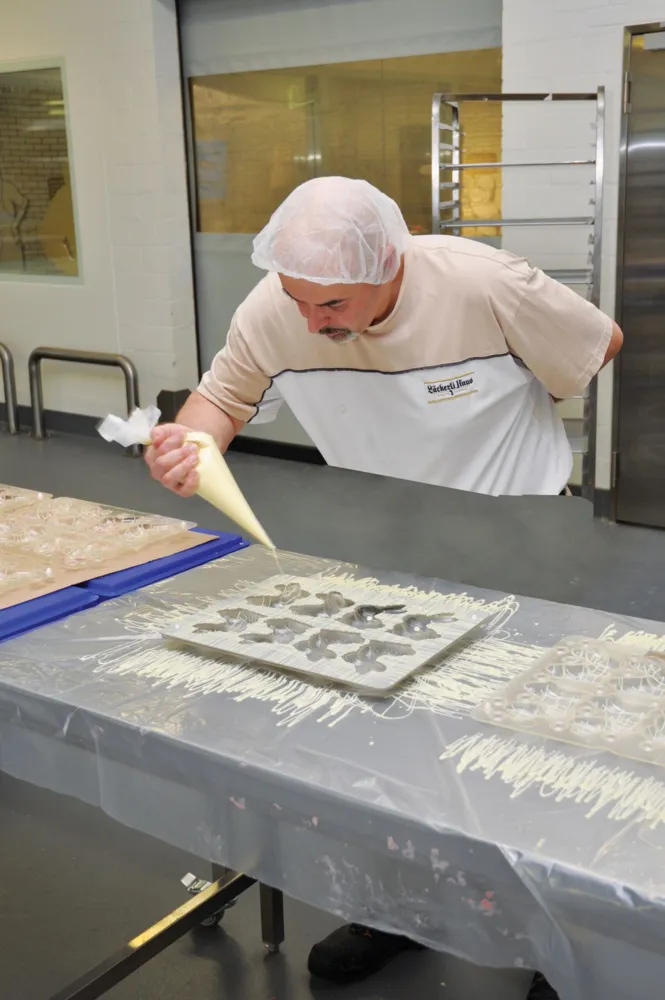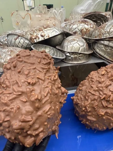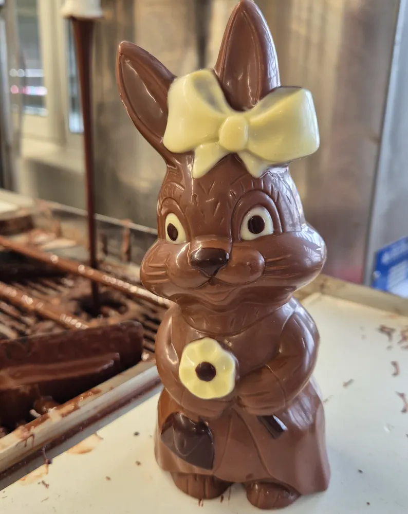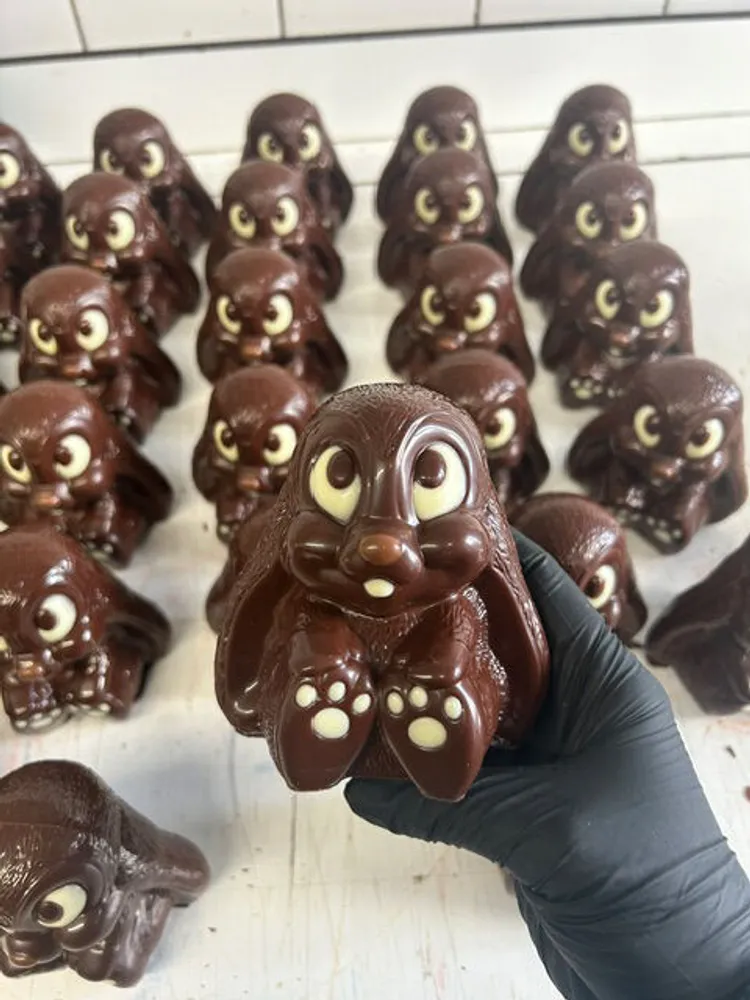 Beschle-Chocolatier Jean ist mit viel Herzblut und Leidenschaft am Werk und kreiert die kultigen Beschle Lampiohr Hasen sowie weiteren Osterkreationen von Hand und mit feinster Schokoladenqualität. Die Hasen werden allesamt in der Manufaktur in der Clarastrasse hergestellt.