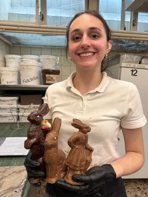 Die Schoggihasen der Confiserie Schiesser bringen nicht nur die eigenen Mitarbeitenden bei der sorgfältigen Herstellung von Hand zum Strahlen. Die Schiesser-Hasen sowie weiteren Osterspezialitäten verbreiten in jedem Osternästli Freude – und dies seit Generationen.