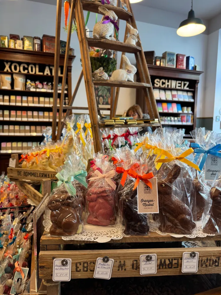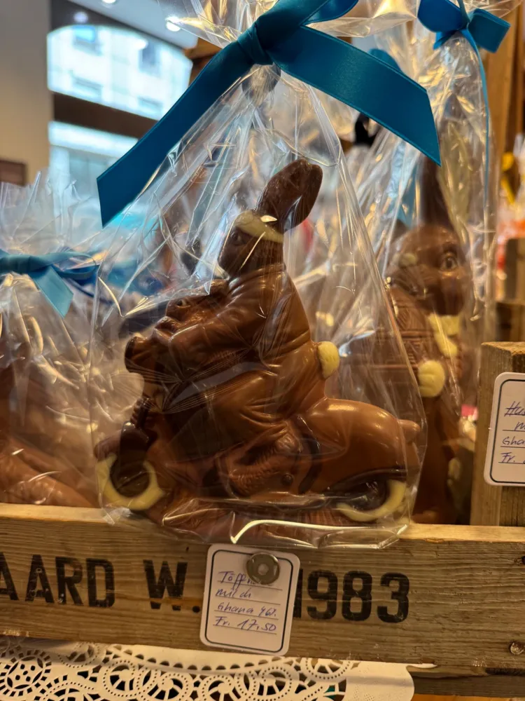 Xocolatl steht für feinste Schokoladenkreationen und eine Vielfalt an Oster-Arrangements. Die Schoggihasen gibts nicht nur in klassischer Form, sondern beispielsweise auch fahrend auf der Vespa – ohne Helm und mit dem kleinen Osterhasen auf dem Vordersitz. Ein süsser Anblick für alle – ausser die Polizei. Bei Xocolatl findest du übrigens auch besondere Geschmacksrichtungen wie Karamell-Salz, Orangen-Muskat, Himbeere, Zitrone oder Mandelkrokant.