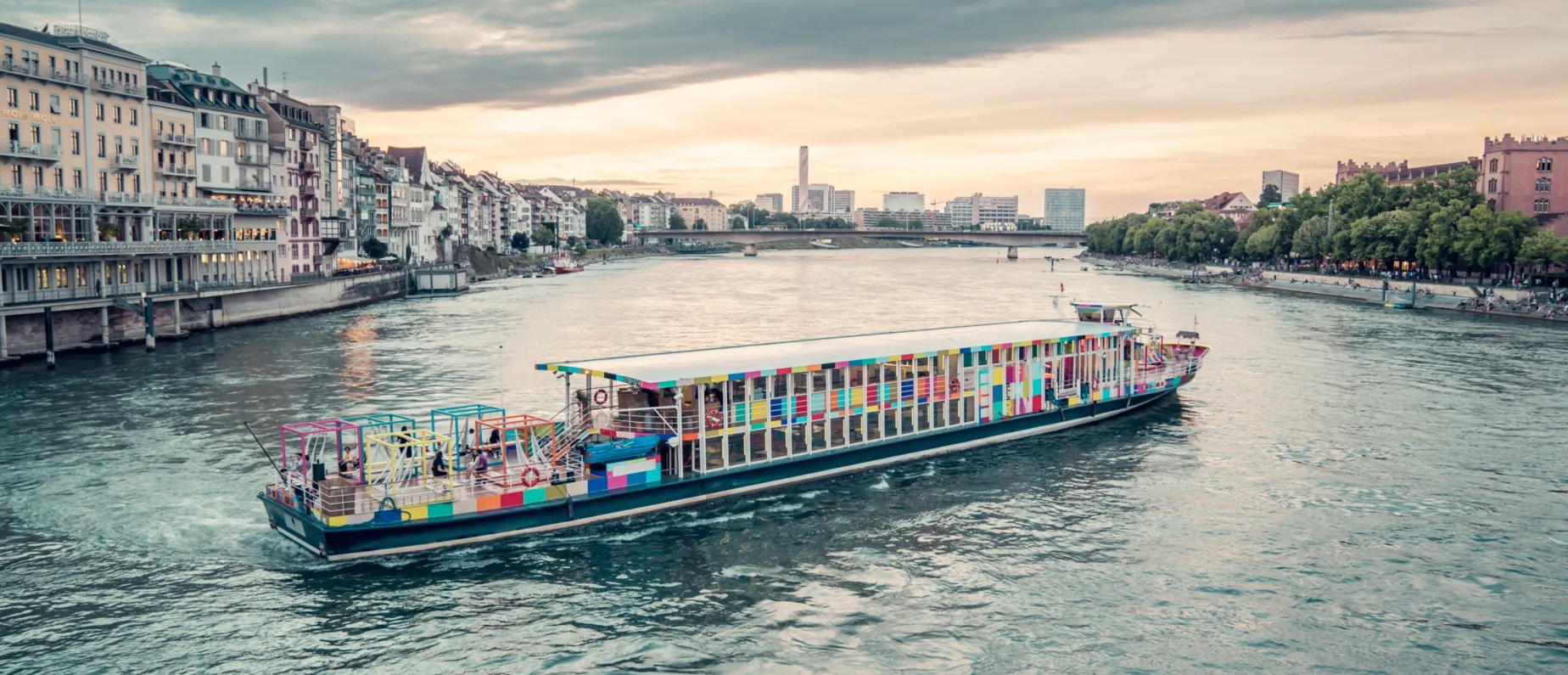 ... der MS Flâneur Christoph Merian, die als bereits im Frühjahr in ein überdimensionales Cocktailschirmchen verwandelt hat und nun als besonders fröhlicher Blickfang den Fluss auf- und abtuckert und mit verschiedenen Events die Baslerinnen undBasler flâneurisiert.