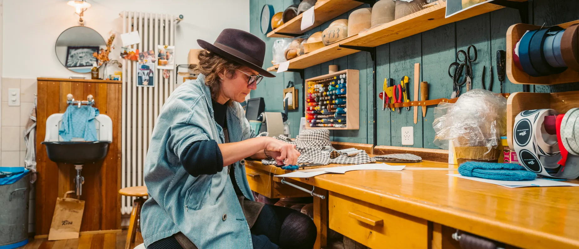 Zuerst stellt sich die Frage nach der Hut-Art: Sommer oder Winter? Danach wird der Kopfumfang gemessen, bevor es an die Materialauswahl geht. Die Sommerhüte bestehen oft aus Stroh. Diese nähen wir beispielsweise in unserem Atelier noch selbst, auf einer alten Maschine. Auch die Filzhüte stellen wir nach wie vor selber her. Geformt werden die Hüte noch immer auf Holzformen; entweder durch Ziehen oder den Dampf des Bügeleisens.