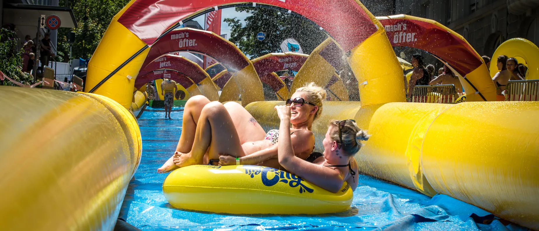 «Slide my City» heisst er Action-Event, der in mehreren Schweizer Städten angeboten wird. Tickets dafür gibt’s im Vorverkauf, wo du dich auch bereits entscheiden musst, zu welcher Zeit du die Wasserrutsche benutzen willst. Ein Ticket ist eine Stunde lang gültig. Vergiss zudem nicht, deinen Ausweis mitzubringen, denn du musst im Vorfeld einen Haftungsausschluss unterzeichnen. Kinder und Jugendliche unter 18 Jahren müssen diesen von den Eltern unteschreiben lassen. Bitzli Bürokram also im Vorfeld, aber dafür ist der Spass danach umso grösser!