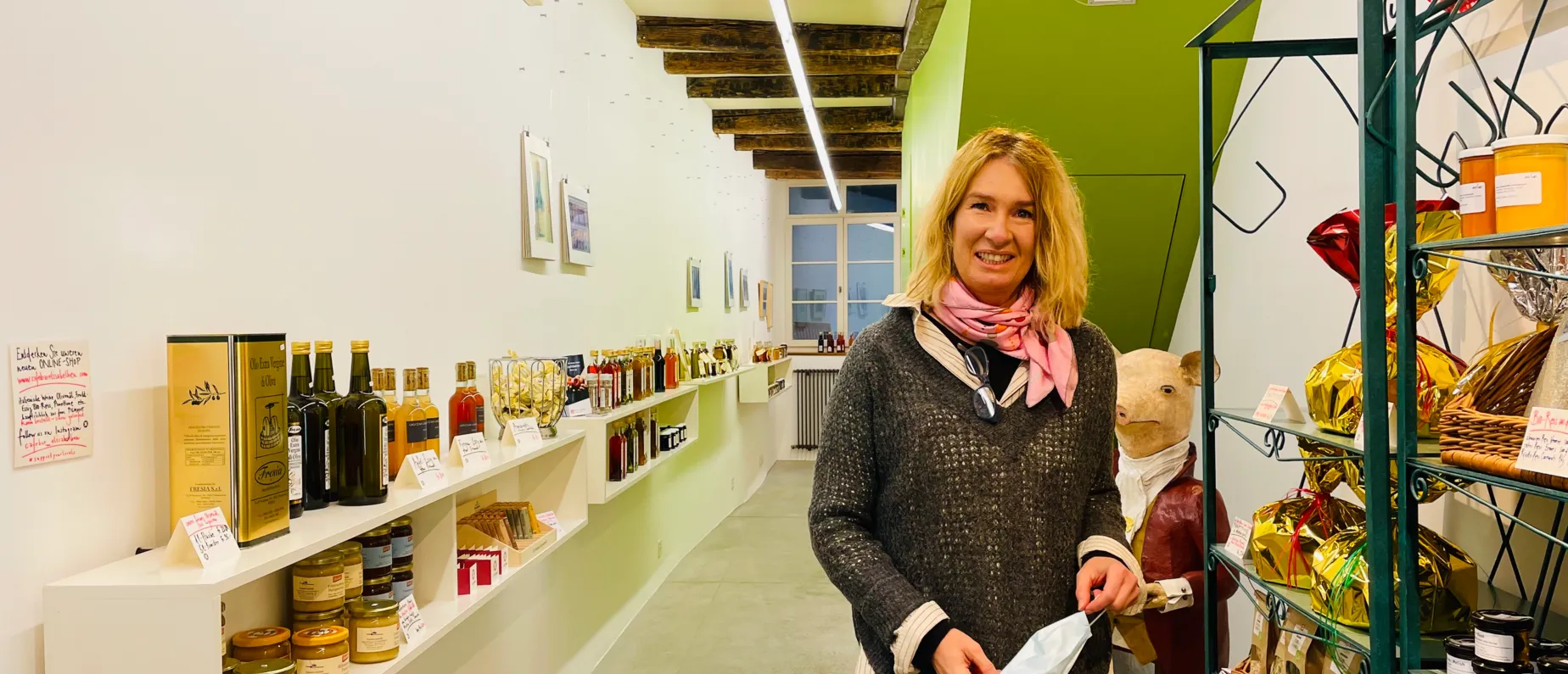 Es ging ratzfatz. Als klar war, dass Christine Vogt ihren Ausstellungsraum für Kunst und Kunsthandwerk KUNSTpART aufgrund des Lockdowns schliessen musste, hat sie schnurstracks die Tablare an der Wand geräumt, um Platz für die feinen Lebensmittel der vielen Produzenten und Lieferanten aus der Region zu schaffen. «Schlussendlich mach ich nun genau das Gleiche wie vorher: Anstatt Kunst von Künstlern zu zeigen, ist es nun einfach regionale Genusskunst, welcher ich eine Plattform biete.»