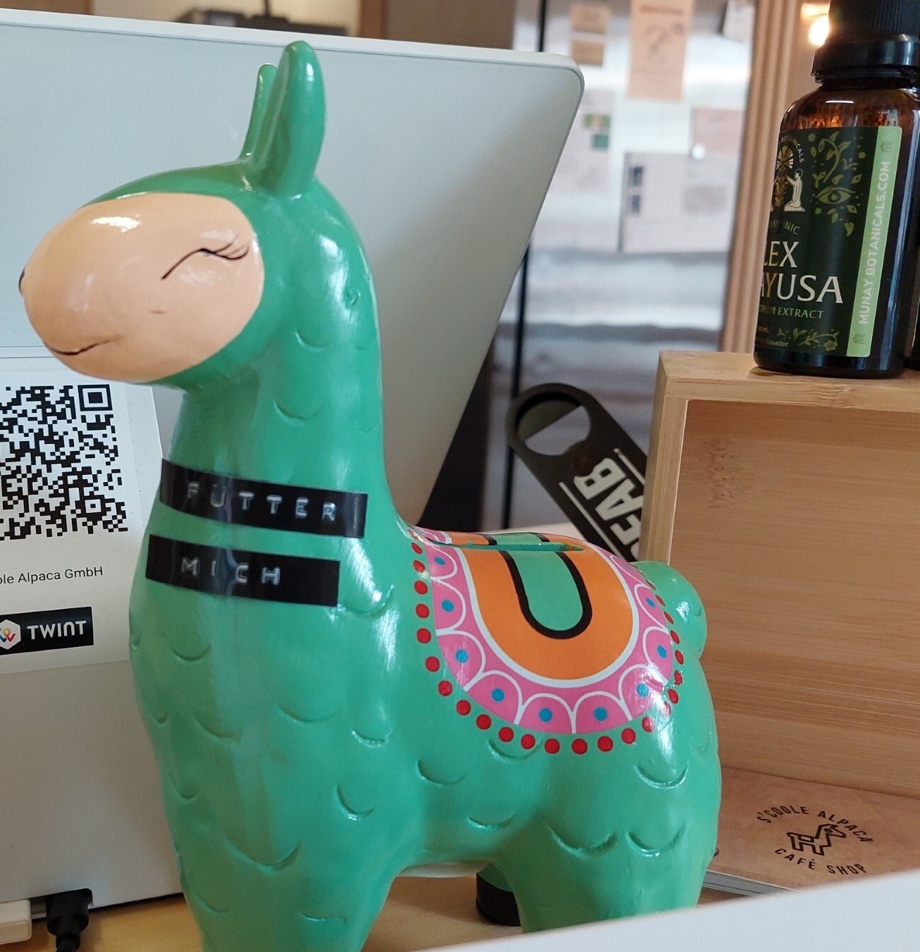Grossgeschrieben werden hier die Nachhaltigkeit und die Gemütlichkeit. Die Möbel sind alle aus der Brocki, neben Holzstühlen gibt es eine Sofaecke, die zum Verweilen einlädt. Wer hier zur Auszeit vom Alltag vorbeikommt, wird von sanfter Hintergrundmusik und einem gutgelaunten Team begrüsst. Und natürlich von ganz vielen Alpakas, die sich in Form von Plüschtieren, Tassenmustern und Trinkgeldkässeli im Raum verteilt aufhalten. Der Name für das Café kommt aus Cristians Heimat: «In Ecuador gibt es den Hochlandteil der Anden, dort wohnen unter anderem die Alpakas. Die Tiere gefallen mir.»