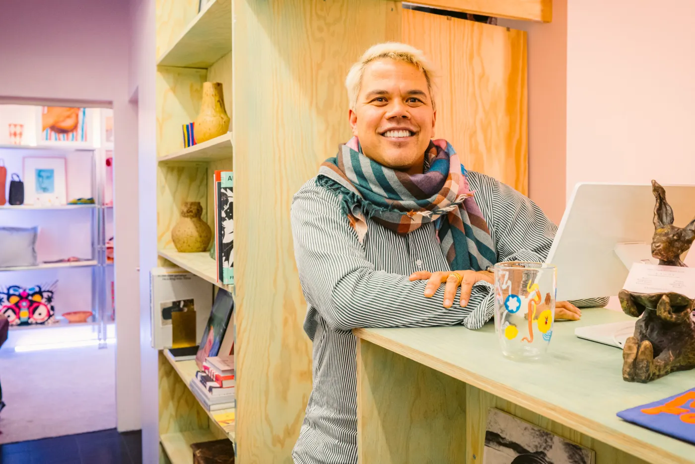 Der studierte Kulturwissenschaftler und bildende Künstler leitete bereits Galerien in Basel, Zürich und New York. Er konzipiert und realisiert Ausstellungen mit Schweizer und internationalen Kunstschaffenden, publiziert Kataloge und Künstlerbücher. «Und nun bin ich obendrauf – gemeinsam mit meinem Partner – stolzer Boutique-Besitzer», sagt er mit einem Zwinkern. Natürlich ist er weitaus mehr. Saalhof vereint all seine bisherigen Tätigkeiten und Erfahrungen in der Kunstbranche mit seinen persönlichen Beziehungen und Leidenschaften.