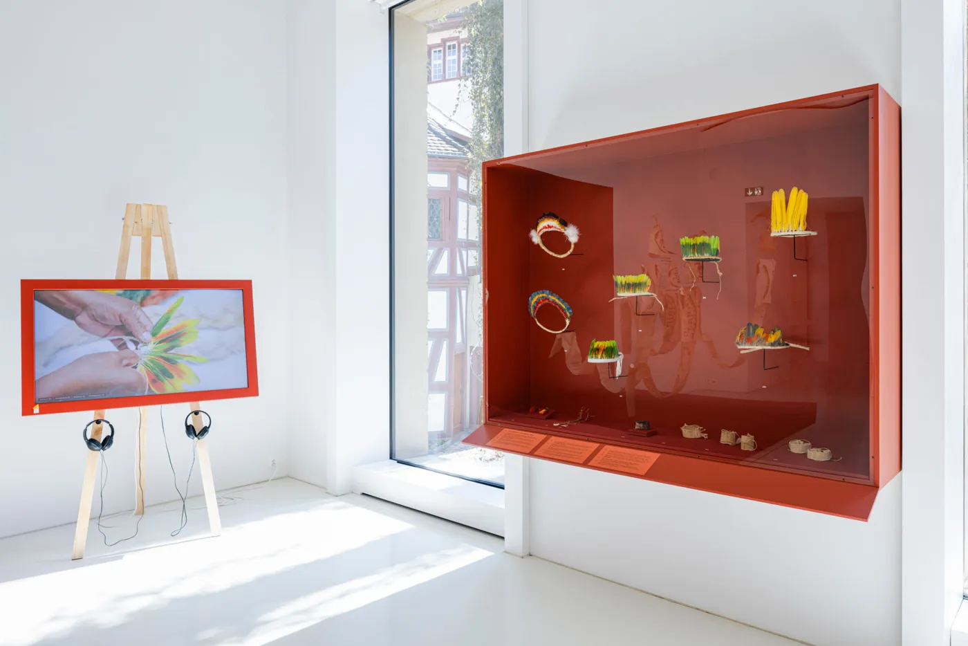 Für Dora Kuira war es spannend zu sehen, wie sich das Handwerk und die Materialien in all der Zeit verändert und weiterentwickelt haben – und heute teilweise gar nicht mehr verwendet werden. Speziell für die aktuelle Ausstellung hat sie dann letztes Jahr Federschmuck angefertigt, der für ihre Familie charakteristisch ist und sie mithilfe von Vorbildern von Museumsexponaten von Hand geknüpft hat. Diese Arbeit wurde vom Hausfotografen des Museums, Omar Lemke, kunstvoll festgehalten.