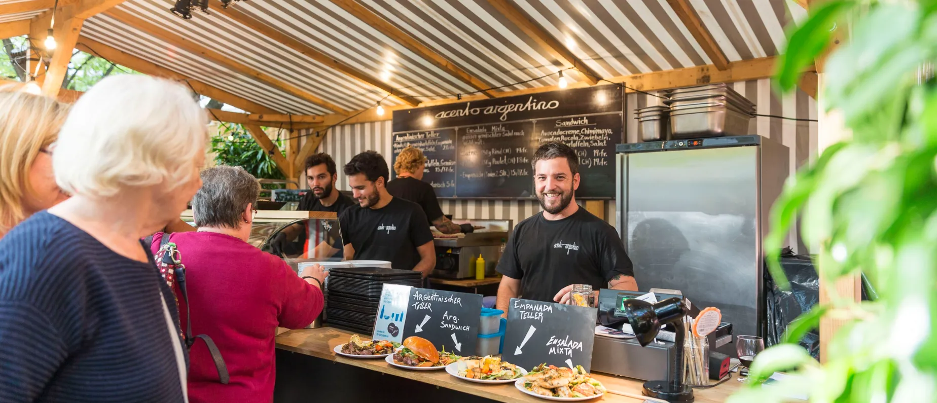 Fünf Stände aus der Markthalle sind vom 2. bis 26. August bei Allianz Cinema auf dem Münsterplatz zu Gast und verbreiten mediterran-exotisches Streetfood-Feeling. So kannst du dich jeweils vor und während den cineastischen Highlights rund um den Erdball futtern: I love Sushi, La Taparia, Acento Argentino sowie Fish’n’Chips von The Codfather kreieren gemeinsam ein vielseitiges Gastroreich unter dem Blätterdach der Kastanien. Die thailändische Küche von Aruni's Thai Food rundet den Kulinarik-Spaziergang ab. Wer kein Film-Ticket hat, kann auch nur zum Essen auf den Münsterplatz kommen.