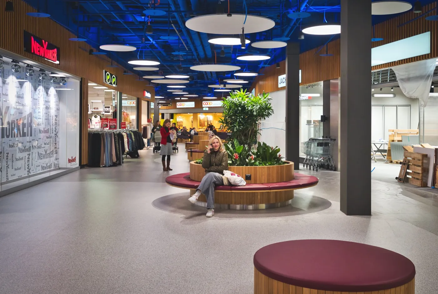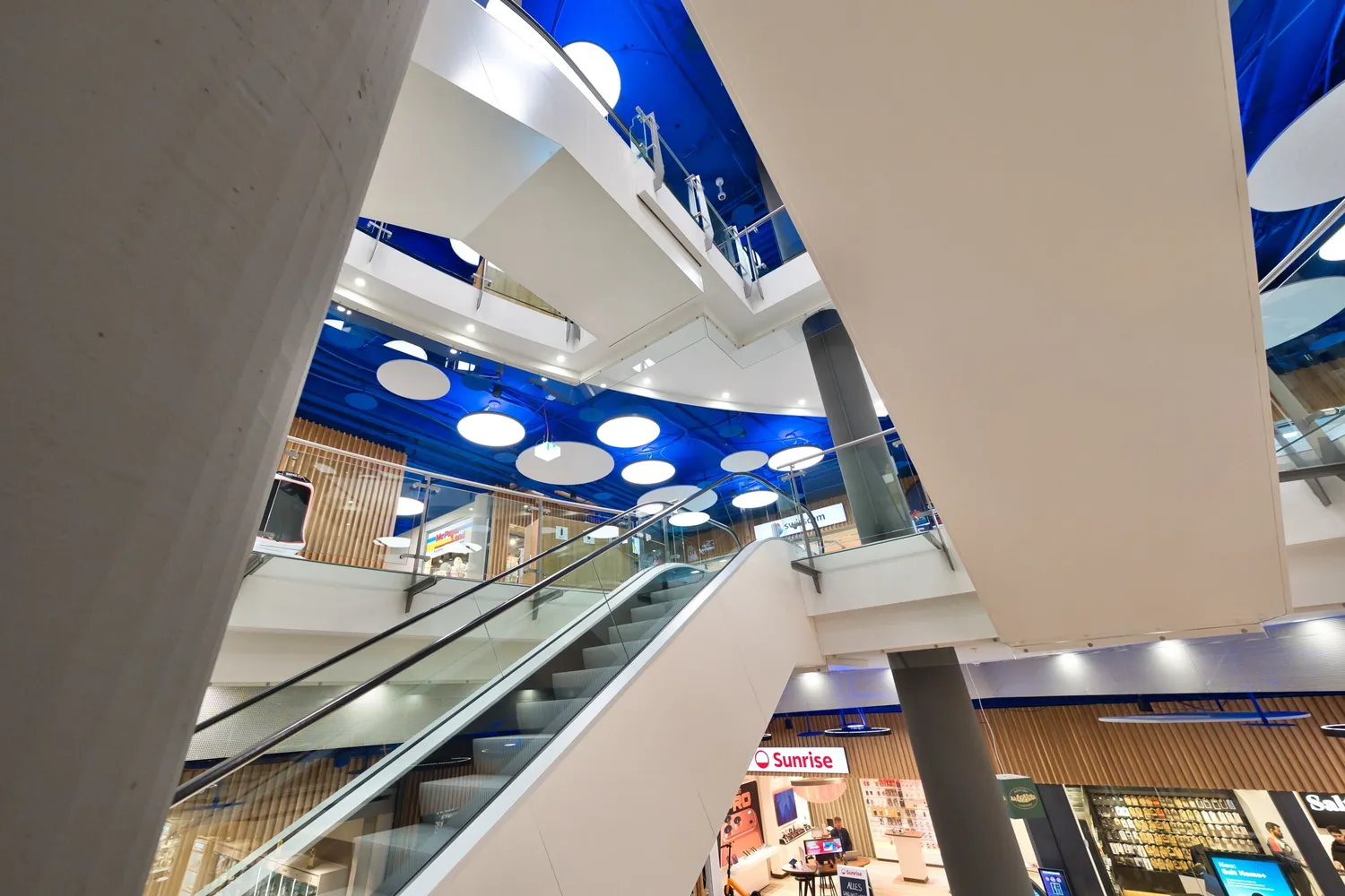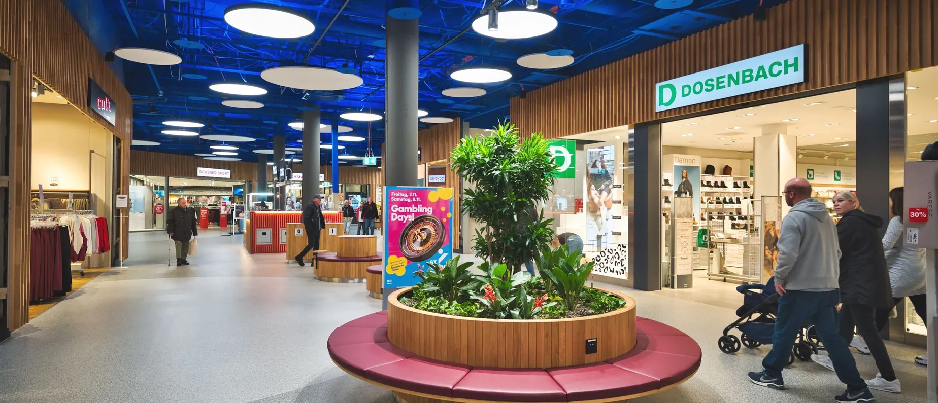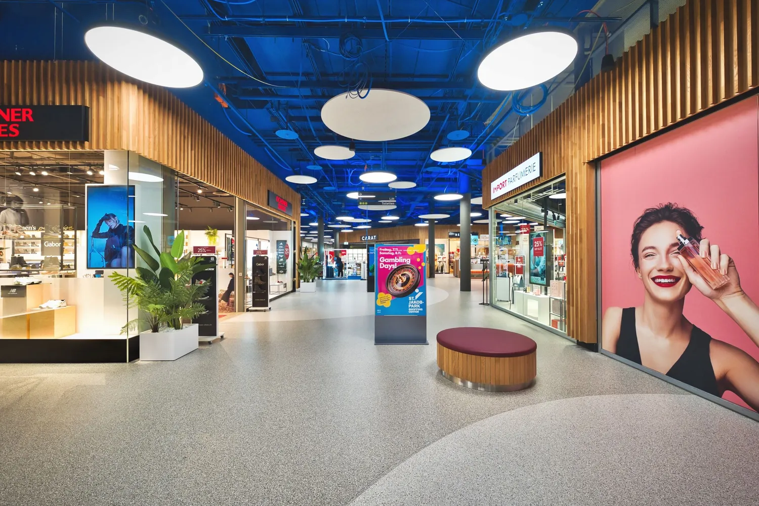 Die Modernisierungen können sich durchwegs sehen lassen. Eine der auffälligsten Neuerungen betrifft die Ladenfronten. Diese wurde im ganzen Center vereinheitlicht und mit einer schönen Holzverkleidung versehen – eine stilvolle, optische Aufwertung, welche für viel Ruhe im Erscheinungsbild des Shopping Centers sorgt. Dazu tragen auch die neuen Bepflanzungen bei, das harmonische Farbkonzept mit blauer Decke, Akkustikpanelen und Lampen, welche einen Himmel samt Wolken symbolisieren, sowie die neuen Sitzinseln, die die Aufenthaltsqualität verbessern.