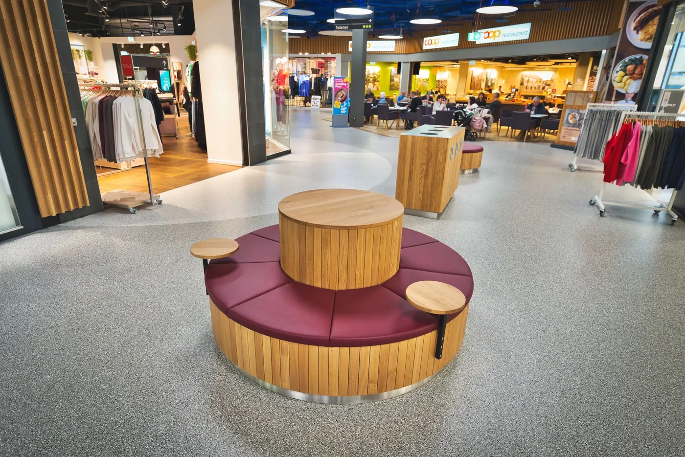 Für die Sitzinseln, sowie auch die neuen Abfallstationen wurden übrigens alte Holzelemente wiederverwendet, die bereits an anderer Stelle im Shopping Center gebraucht wurden und so ein neues Leben erhalten. Nachhaltigkeit und Kreislaufwirtschaft stellen somit zwei zentrale Leitprinzipien beim Umbau und den Modernisierungsmassnahmen dar.