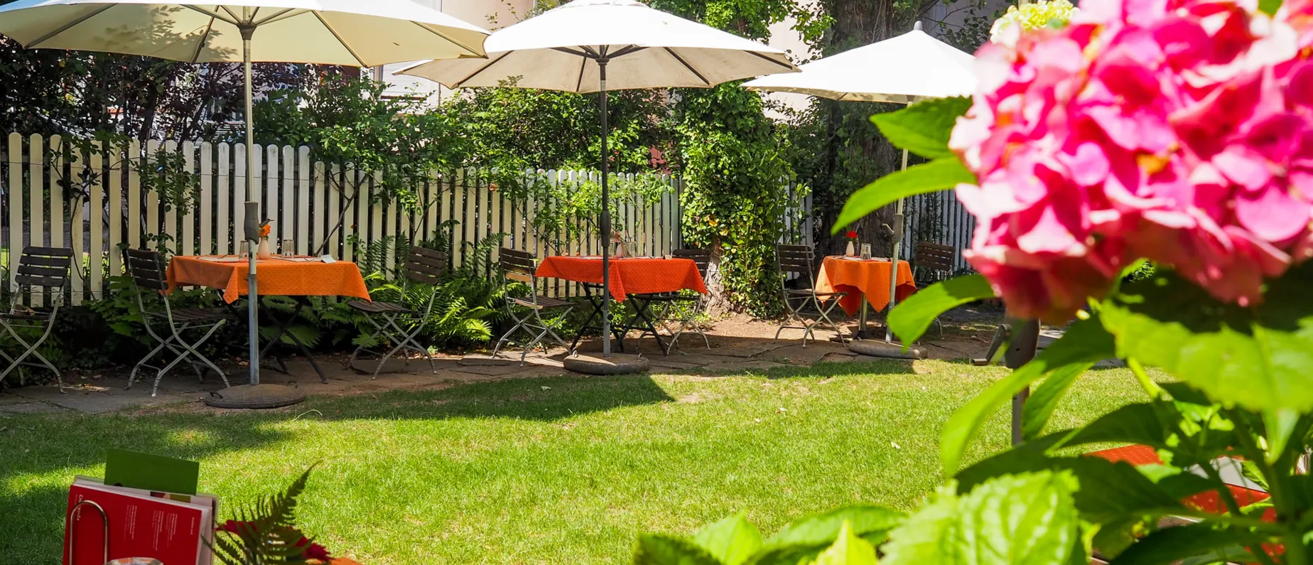 Aber zurück zum Bistrot und der Oase. Wochentags durchgehend von 9:00 bis 16:00 Uhr geöffnet, stehen die Tore zu ihrem wunderschönen Garten im Sommer sogar bis 20:00 Uhr offen. Der etwas unscheinbare Eingang von der Strassenseite führt in einen prächtigen Garten mit Pergola und bietet rund 40 Sitzplätze. Ob morgens, mittags oder nachmittags, ob im Schatten mit freiem Wlan arbeitend oder an einem Sonnenplatz erholend, in dieser bezaubernden Umgebung entflieht man dem Alltag im Nu.