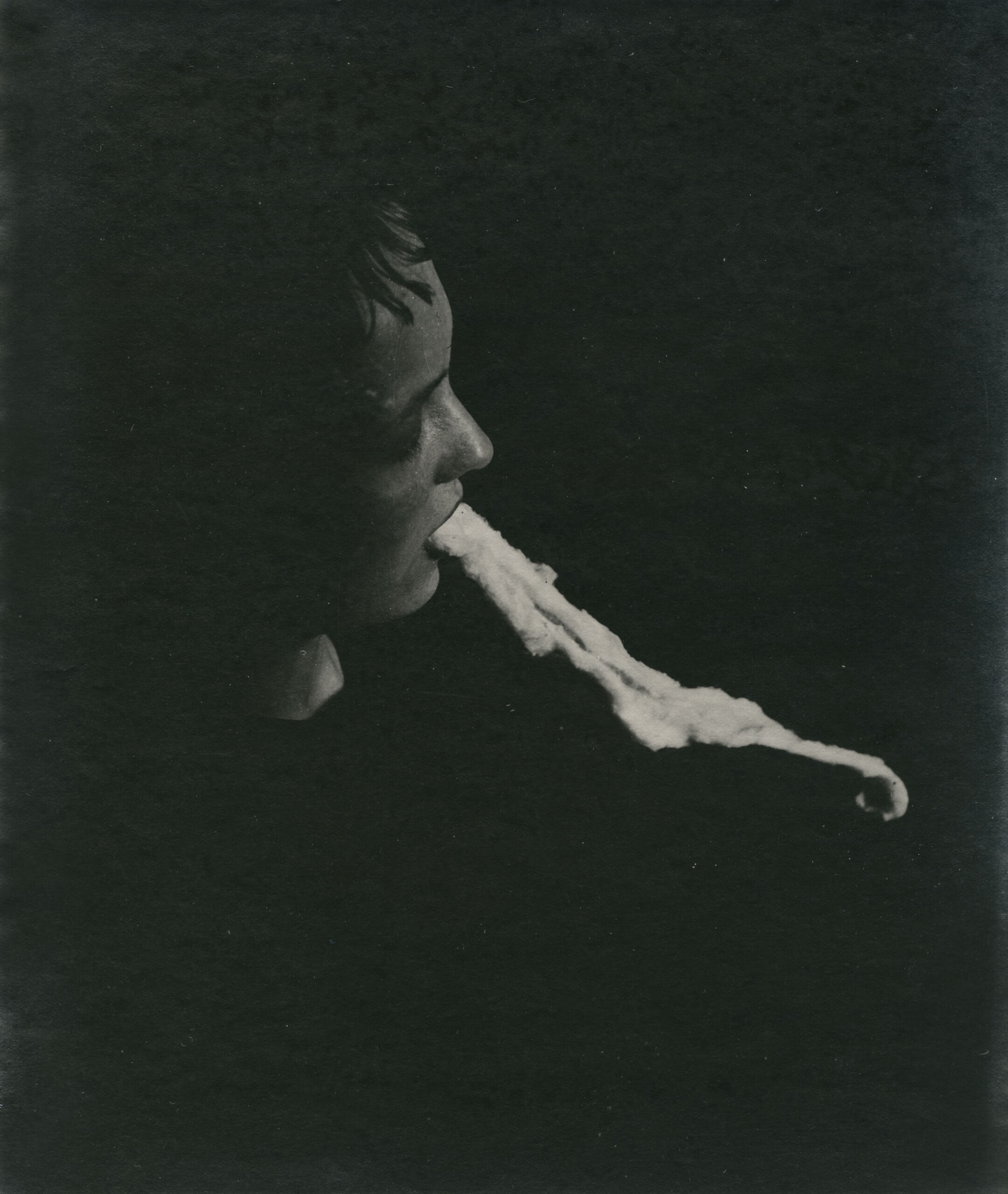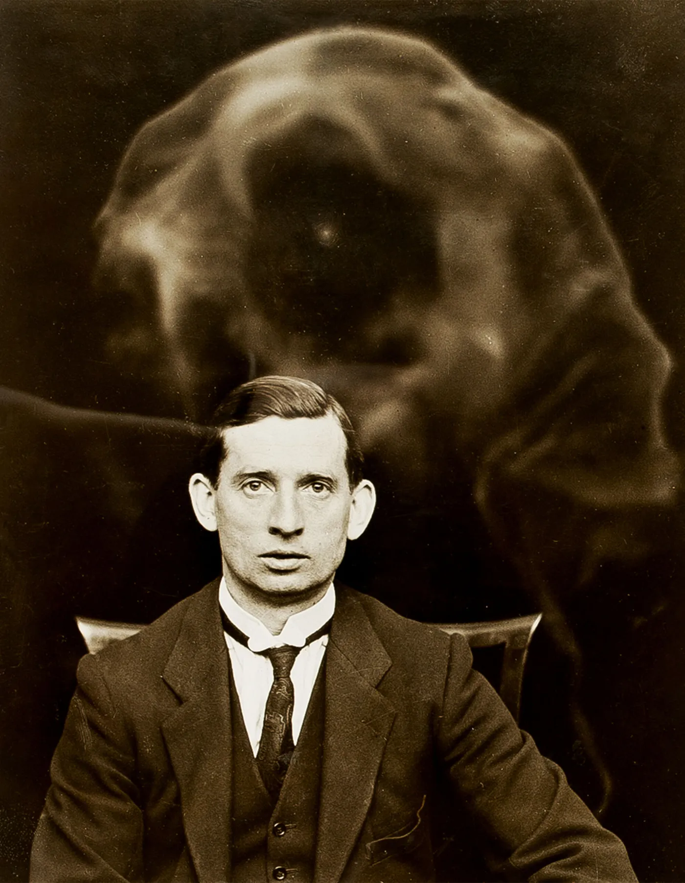 Links: Spirit photograph von Staveley Bulford (1921), rechts: Teleplastische Masse, die aus dem Mund des Mediums Stanislawa P. herausquillt und in schwebender Stellung verharrt von Albert Freiherr von Schrenck-Notzing (1913)