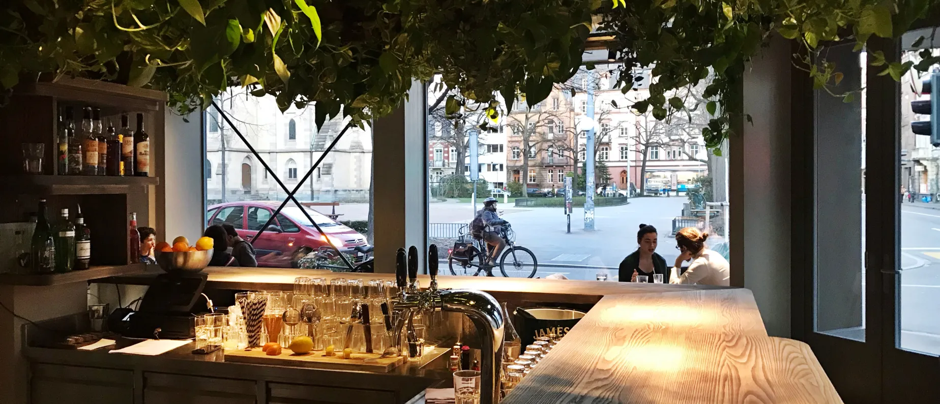 Ein hängender Garten über der Bar, ganzer Brokkoli aus dem Ofen, nachmittags Soja-Cappu und abends Negroni – und das umzingelt von einer Fensterfront, durch die du das Geschehen im Kleinbasler Kuchen beobachten kannst ... langweilig wird’s hier nicht. Und falls doch: Das Lokal eignet sich auch bestens, um ein bisschen am Laptop zu schäfferlen.