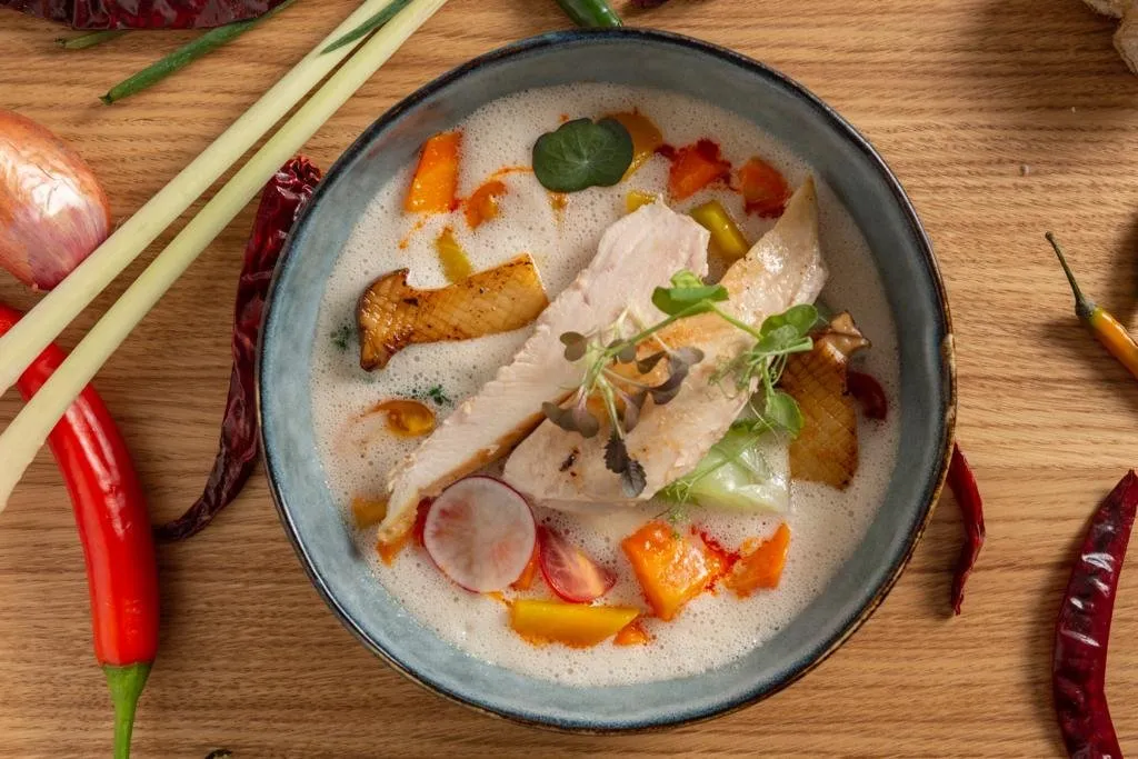 Von der Bar gibt’s hausgemachte Erfrischungen wie beispielsweise Butterflyblütentee mit Limette oder Mangosaft mit frischer Minze. Auch die bunten Smoothies und Signature Cocktails wie der Aperol Spicy Ginger oder der Tom Yam Mekhala (eine Mischung aus Mekhong Whiskey, Anchanblütensaft, Chili, Galgant und Zitronengras) machen Lust auf mehr.