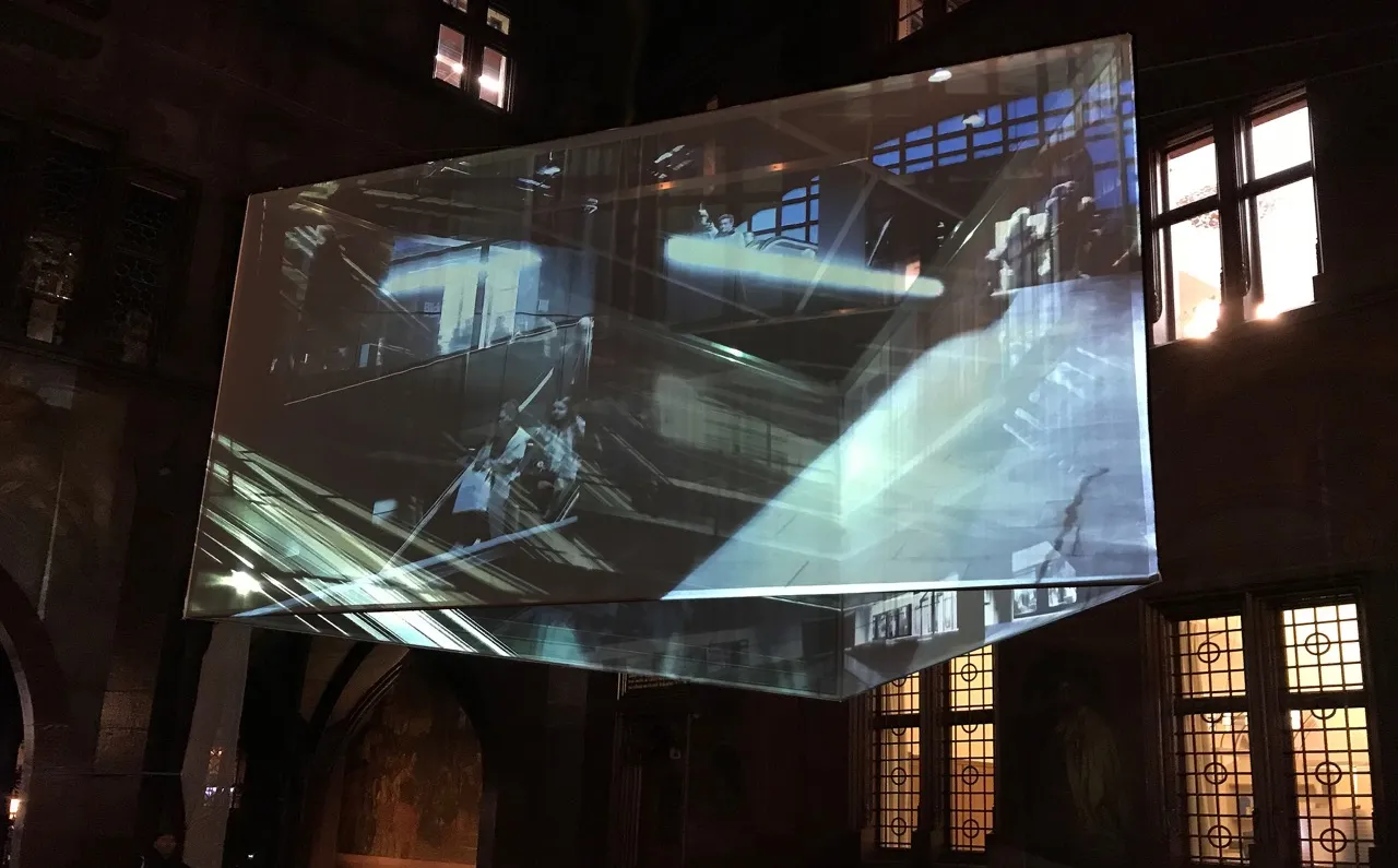 Huch, da schwebt ein riesiges Gebilde im Rathaushof! Darauf zu sehen sind Szenen aus Basel, untermalt mit Stadtgeräuschen - faszinierend futuristisch mutet das Ganze an und dabei gleichsam vertraut.