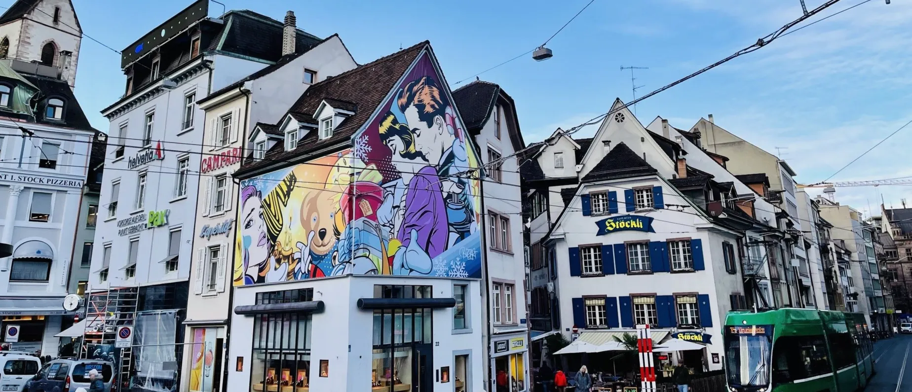 Er ist der Mann der grossen Wände und offenbar auch ein grosser Romantiker: Der Basler Streetart-Künstler BustArt hat Basel bereits das überdimensional schmusende Pärchen auf dem Bell-Areal beschert – jetzt freuen wir uns zudem über gefühlvolle Festtagsstimmung an der Maison Oris. Bereits im letzten Jahr hing hier ein Gemälde der Basler Künstlerin Patrizia Stalder, das nach dem Abbau zu wiederverwendbaren Shoppern upgecycelt und zugunsten lokaler Gemeinschaftsprojekte verkauft wurde. Das wird im Frühjahr auch mit dem Werk von BustArt geschehen.