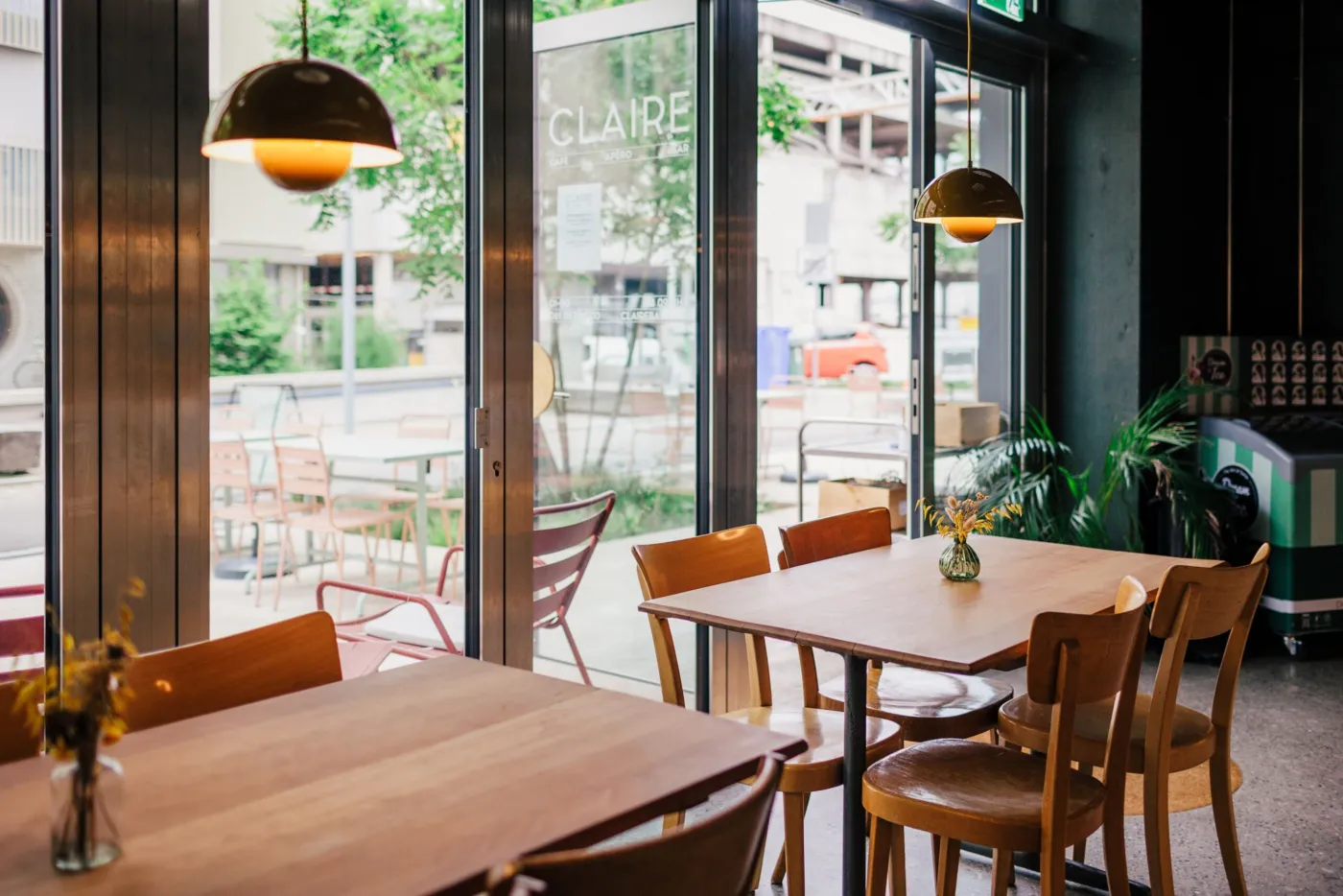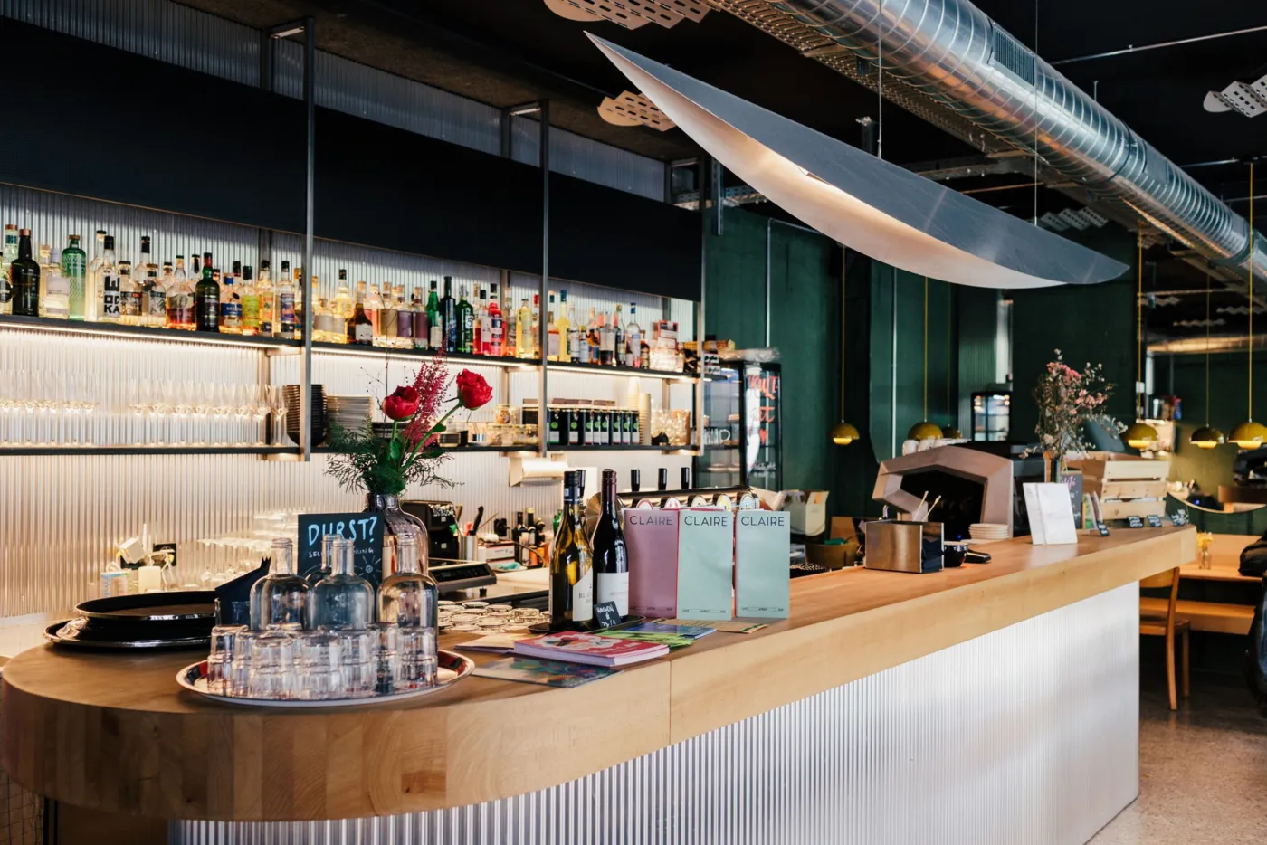 Was aber gebaut ist, hat Vorzüge. «Die Umgebung hier hat etwas von Dorfcharakter: Ruhig, gemütlich, schön», sagt Geschäftsführer Yannick Studer, während er am langen Tisch im Claire sitzt und helles Licht durch die Fensterfront fällt. «Ich bin immer noch total happy über das Claire – es ist einfach ein richtig schöner Ort.» Dennoch ist fürs Claire Durchhaltefähigkeit angesagt: Wegen der langwierigen Bauprozesse ist die weitere Nachbarschaft heute noch nicht so ausgebaut, wie sie es sein sollte. Doch zum Glück ist das Claire mehr als ein Quartiercafé für Anwohnende. Es ist ein Verweil- und Durchgangsort in einer der grössten Entwicklungen von Basel-Stadt. Die entspannte Atmosphäre tagsüber und die Gemütlichkeit am Abend machen das Café mit Bar einzigartig: Wer in gepflegter Stimmung an einem der architektonisch angesagtesten Orte von Basel teilhaben will, ist hier richtig.