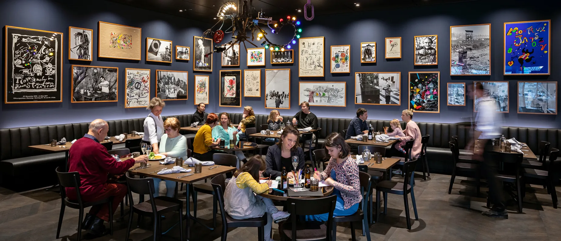 Mit dem neuen urbanen und französischen Ambiente kommt auch der Meister selbst besser zur Geltung. Die eindrucksvollen und aussergewöhnlichen Werke von Jean Tinguely bilden einen schönen Kontrast zu den dunkelblau gestrichenen Wänden und entfalten dadurch eine umso stärkere Wirkung. Hinzu kommen die kunstvollen Lampen, die man einfach stundenlang bestaunen könnte. Ja, hier kann man sich verweilen – egal ob in Kombination mit einem Museumsbesuch oder ohne.
