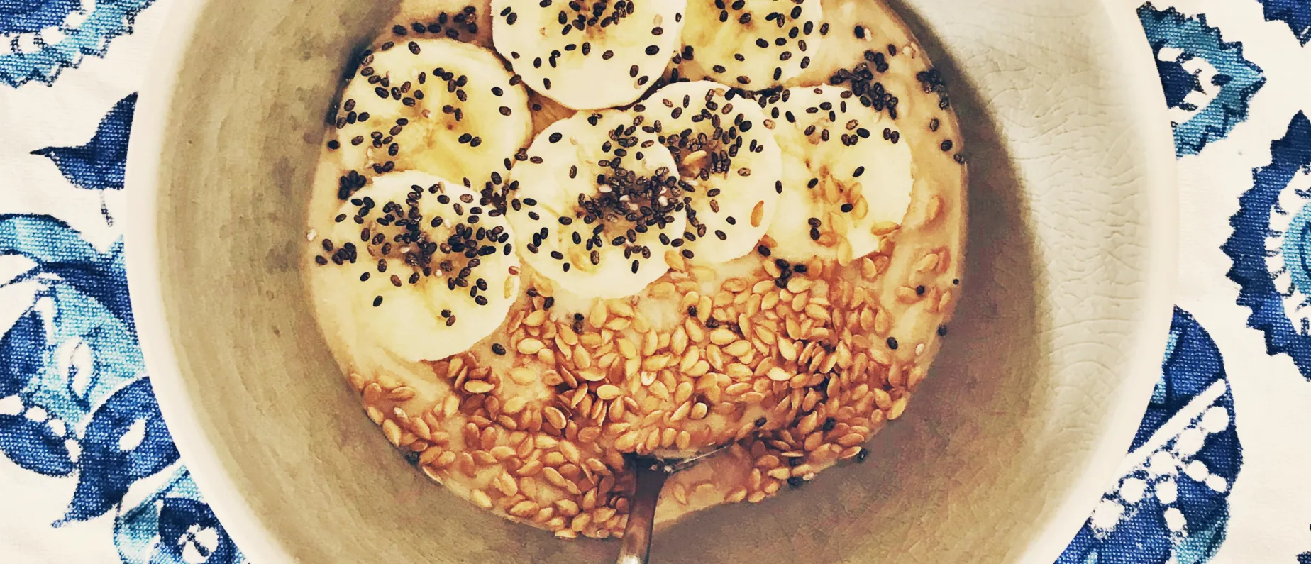 Wir schnippeln noch eine Banane rein – einfach weil es kaum was Besseres gibt als Kaffeejoghurt mit Banane – und streuen ein paar Lein- und Chiasamen drüber.
