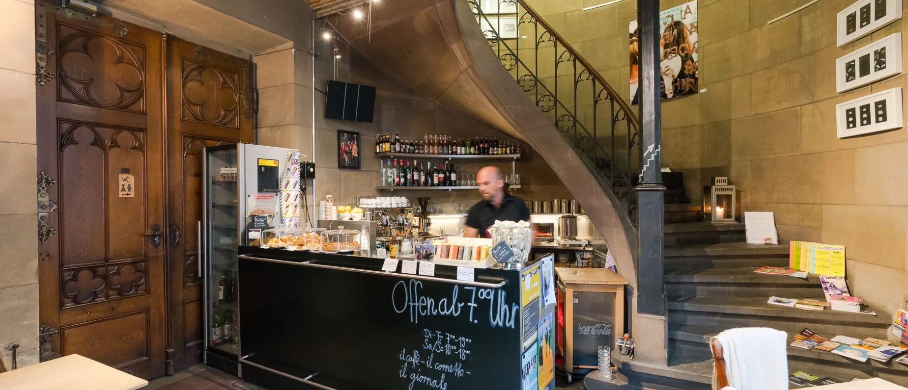 Wenn du schon einmal im Sommer durch die Elisabethenstrasse gefahren oder gelaufen bist, dann können dir die Sonnenanbeter, welche im kleinen Café in der Offenen Kirche Elisabethen genüsslich ihren Kaffee schlürfen, unmöglich nicht aufgefallen sein. Dank der günstigen Lage der gegenüberliegenden Häuserflucht und des grossen Platzes gleich neben der Kirche geniessen die Gäste nämlich das Privileg, praktisch von morgens bis abends von der Sonne geküsst zu werden. Aber auch beim Blick hinter die grosse und schwere Holztüre wird man keinesfalls enttäuscht, denn das eigenständige Café profitiert enorm von der beeidruckenden Architektur der Kirche, in welcher es sich befindet. Die dominante und schwungvolle Treppe führt all jene einen Stock weiter nach oben, die ihren italienischen Espresso oder Kaffee nicht direkt an der Bar oder an einem der kleinen und gemütlichen Tische neben dem Eingang geniessen möchten.