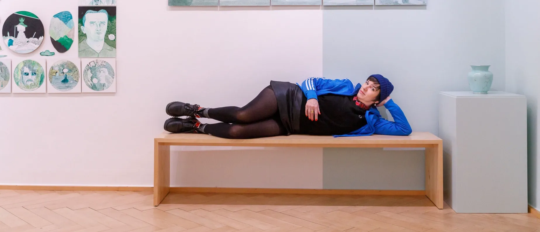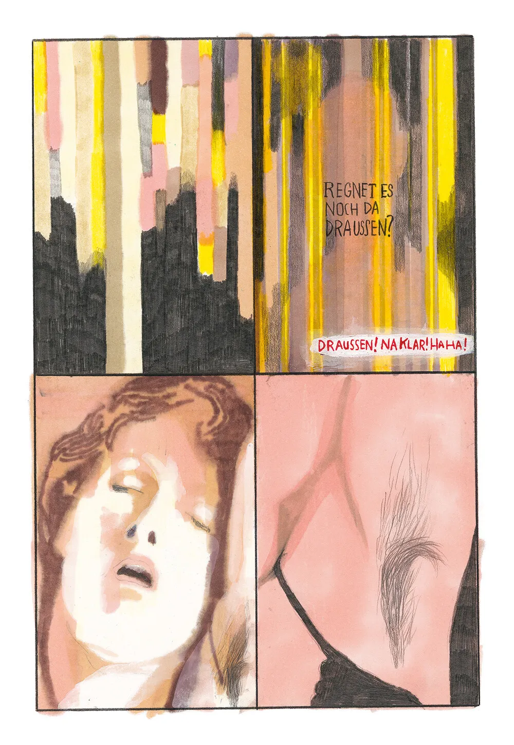 «Untiefen» lautet der geheimnisvolle Titel der Ausstellung, die sich mit Dominique Goblets Schaffen beschäftigt. Das ist mal wild und knallbunt, mal subtil und tiefsinnig, mal abstrakt und assoziativ. Die 1967 in Brüssel geborene Künstlerin hat sich mit ihren eigenwilligen und ganz unterschiedlichen Bildwelten zu einer der bedeutendsten franko-belgischen Zeichner:innen und Mitgestalter:innen des Comics der Gegenwart entwickelt. Sie lässt dabei tief in die Seele der Menschen sowie deren soziale Situation blicken. Die Kommunikation im familiären Umfeld, die Wahrnehmung und Stereotypisierung von Geschlechterrollen durch die Gesellschaft, die Suche nach einer Partnerschaft im Dschungel des Online-Datings oder das Älterwerden sind Themen, denen wir in der Ausstellung begegnen und mit denen uns Dominique Goblet konfrontiert.
