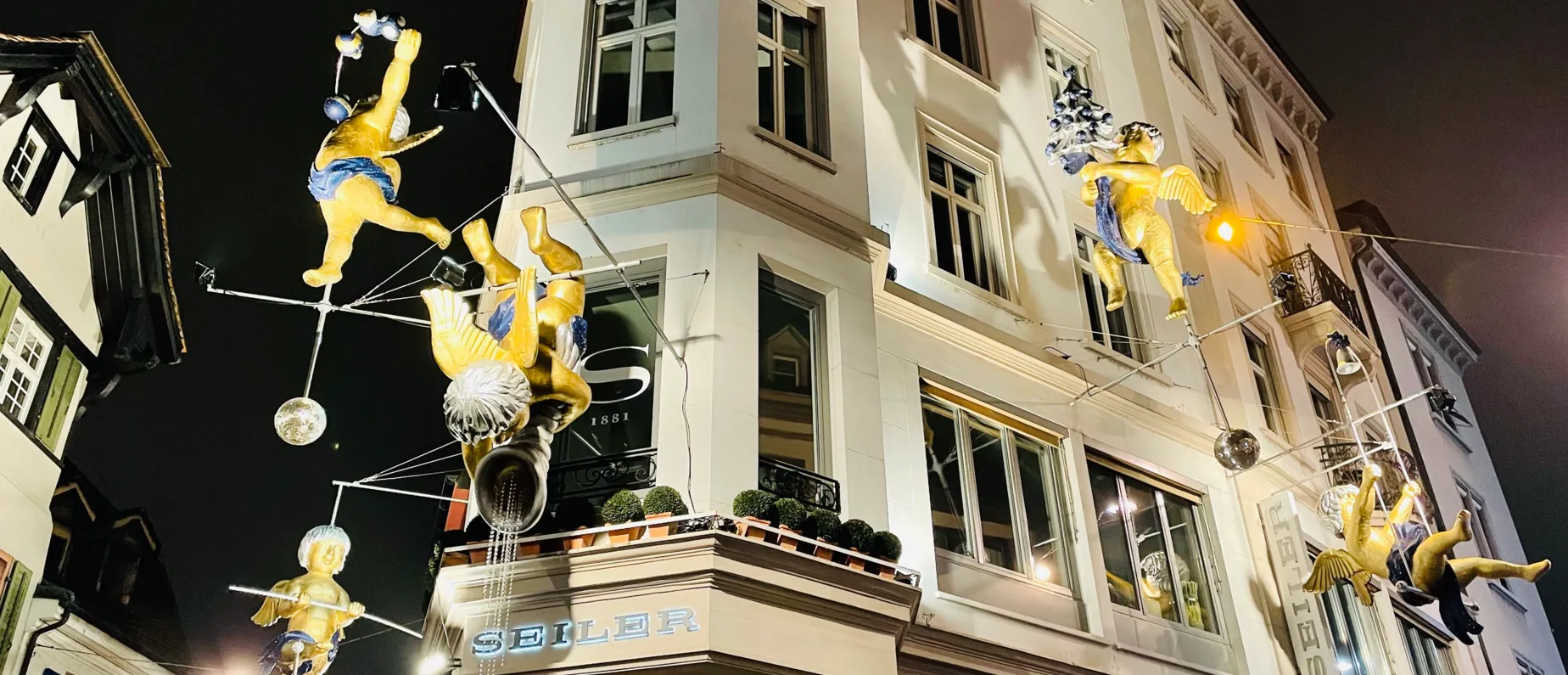 Was vermutlich nur noch wenige wissen: Die Weihnachtsengel haben damals vor über 20 Jahren noch die ganze Gerbergasse geschmückt – dies auf Initiative verschiedener Inhaberinnen und Inhaber angrenzender Geschäfte. Doch bereits nach wenigen Jahren war Schluss. Aufgrund diverser Probleme mit Unterhalt und Organisation verschwanden die damals noch farbigen Engel wieder aus der Gerbergasse. Doch ein Geschäftsinhaber wollte sich noch nicht von ihnen verabschieden: Eugen Seiler, der Vater des heutigen Geschäftsinhabers Alexander Seiler, entschied sich dazu, die Engel zu übernehmen, sie zu vergolden und die Tradition rund um die Fassade seines Juweliergeschäfts in der Weihnachtszeit weiterleben zu lassen. Und von hier aus schmücken sie die Weihnachtsstadt Basel seit mittlerweile über 20 Jahren. Heute führt Alexander Seiler das Familiengeschäft in vierter Generation und hängt genau so an diesen Weihnachtsengeln wie zuvor sein Vater.