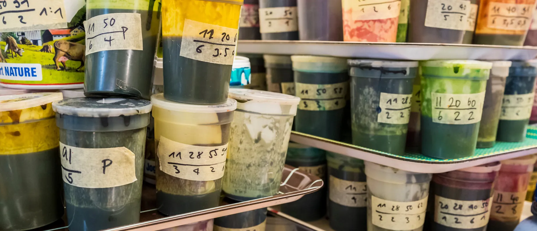 Denn die Matrix-Produkte unterliegen einem strengen Umweltkonzept. Es werden ausschliesslich Stoffe aus Naturfasern (wie beispielsweise Seide, Wolle oder Leinen) verwendet, was gleichzeitig für ein unheimlich angenehmes Tragegefühl sorgt. Zudem wird mit wasserlöslichen Farben gedruckt. Konsequenterweise findet die gesamte Produktion in der Schweiz statt. Kleine Serien werden in der eigenen Textil-Siebdruckerei von Hand bedruckt, in einem kleinen Hinterhof im Bachlettenquartier, wo Fabia auch ihr Atelier hat. Bei unserem Besuch staunen wir über die unerwartete Ordnung, auf dem grossen Tisch in der Mitte stapeln sich einzig ein paar Notizbücher und Tabletts. Daneben deuten ein Piano, eine Strickmaschine und ein paar bepflanzte Samentöpfe auf ihre Hobbys hin. «Gärtnern ist tatsächlich zu einer grossen Leidenschaft geworden und ein guter Ausgleich zum Designhandwerk. Das Piano hilft mir, um abzuschalten. Dagegen ist die Strickmaschine überhaupt kein Hobby, sie steht da, damit ich den Umgang mit ihr nicht verlerne.» Über eine Treppe geht es runter in die Siebdruckerei, wo die Kleinstserien entstehen. Aktuell steht alles still, zeugen lediglich die vielen Farbtöpfe in einer Ecke darauf hin, dass hier zuweilen mächtig was los sein muss. «Die aktuelle Kollektion ist ja schon lanciert und im Verkauf» erklärt uns Fabia. Jedes Jahr entsteht eine neue Kollektion mit 6-8 verschiedenen Designs in verschiedenen Farben. Dafür hat Fabia ein eigenes Farbsystem entwickelt, aus etwa 1300 Farben kann sie feinste Nuancen mittels genauer Rezepturen mischen und für ihre Kollektionen auswählen. «Das ist wichtig, um die Farben genau reproduzieren zu können, denn Muster und Farben sind so definiert, dass sich alle Artikel einer Kollektion untereinander gut assortieren und kombinieren lassen. Natürlich gehen die Farben immer auch auf die aktuellen Modetrends ein.»