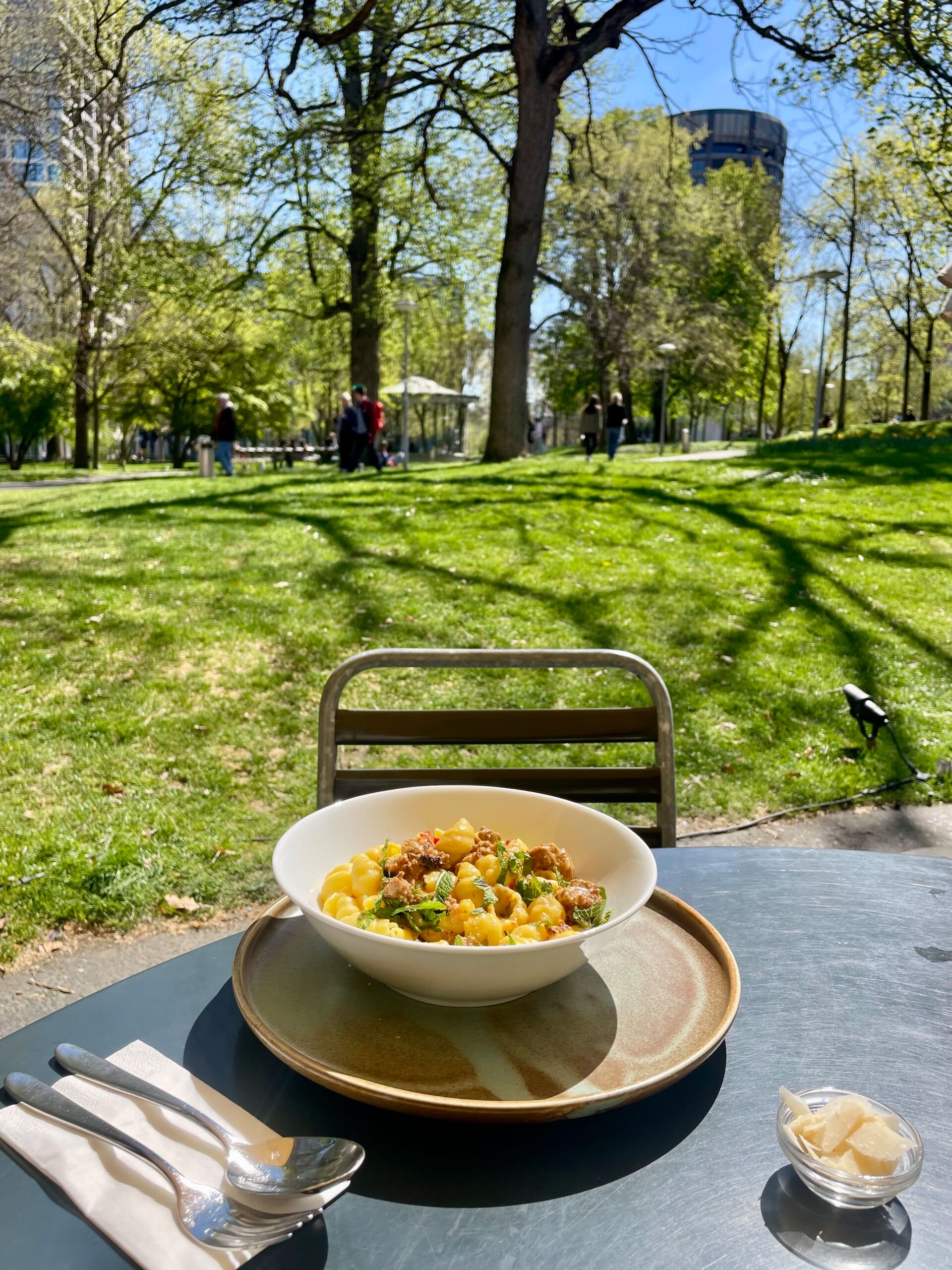 Mittags kommst du dann in den Genuss von authentischer Pasta (täglich zwei Variationen: Vegi und Fleisch) von Santa Pasta, für dessen Comeback der ursprüngliche Gründer Gabriel Tenger in Kooperation mit Roger Greiner verantwortlich ist. Für CHF 22.- geniesst du deine Mittagspause mit feiner Pasta und kannst inmitten des grünen Elisabethenpärklis richtig abschalten und entspannen. So geht Mittagspause mit Santa Pasta!