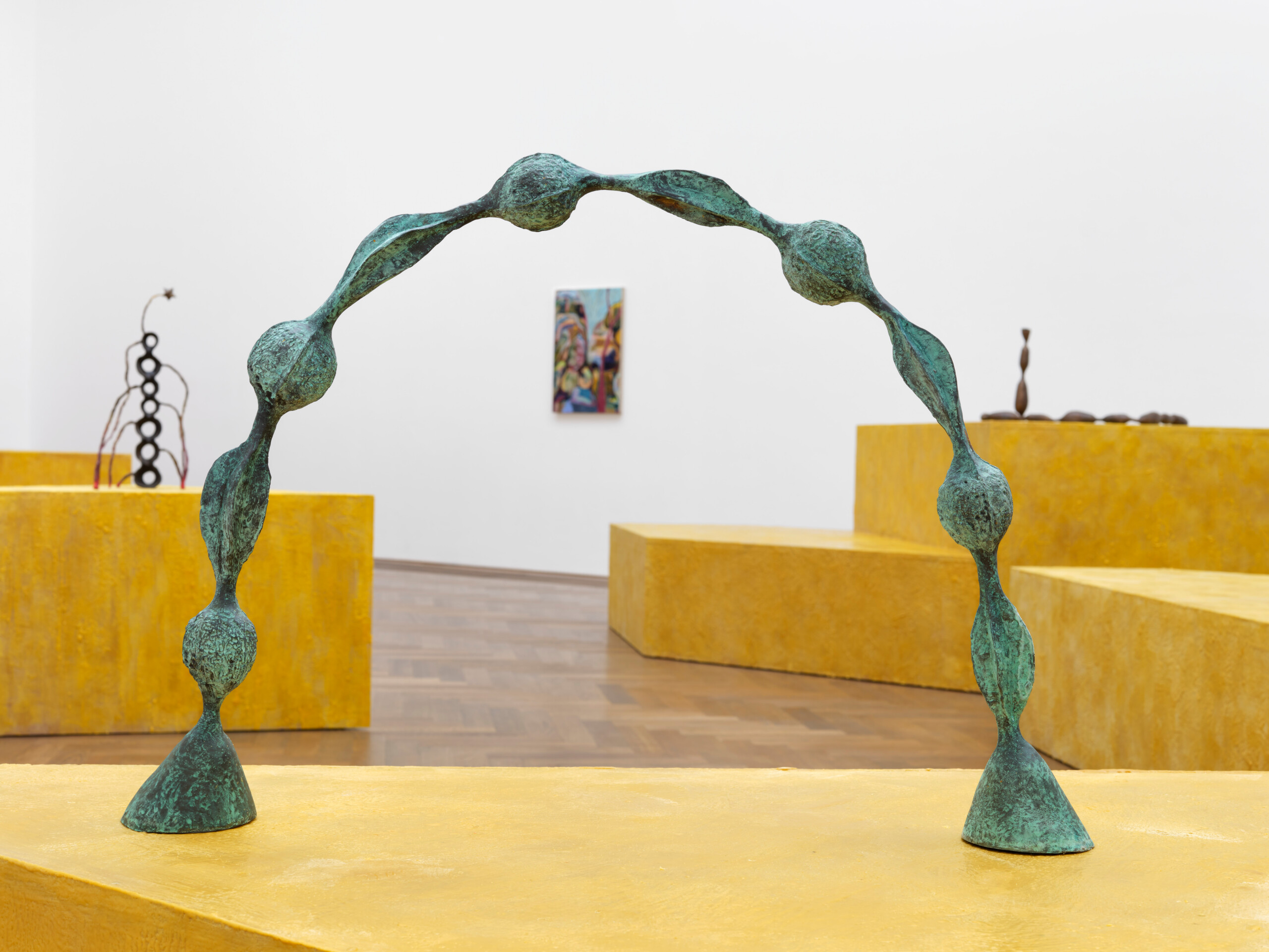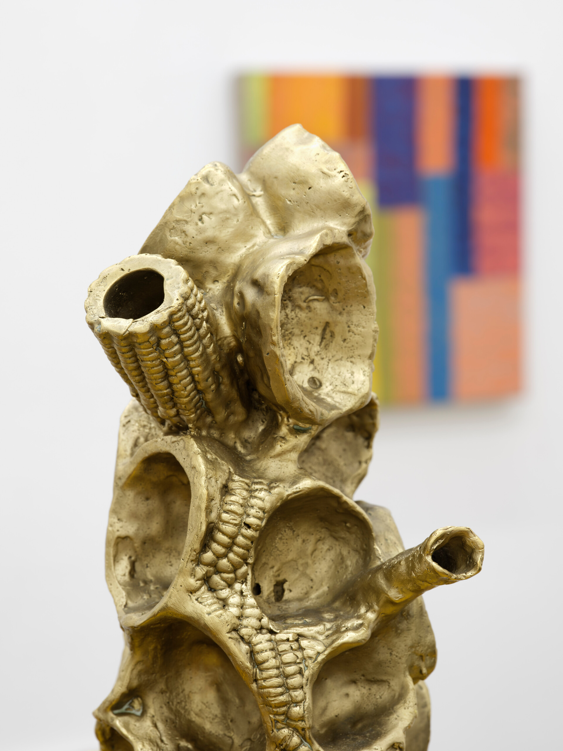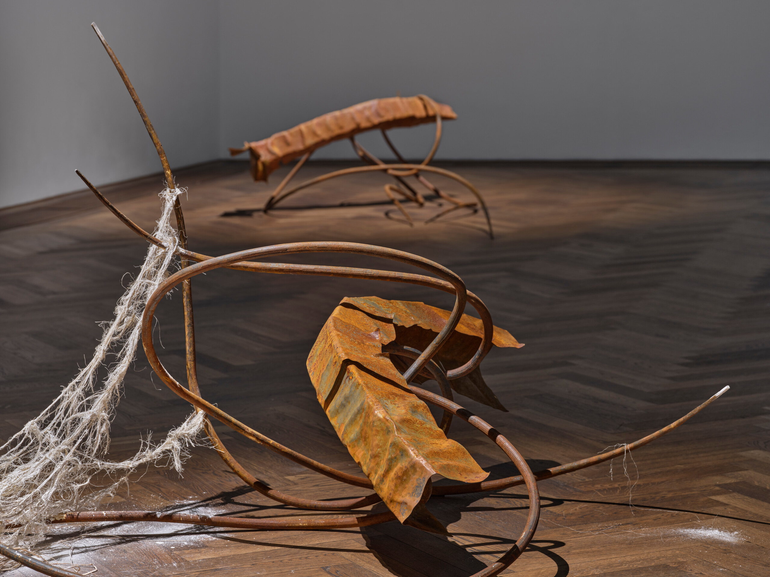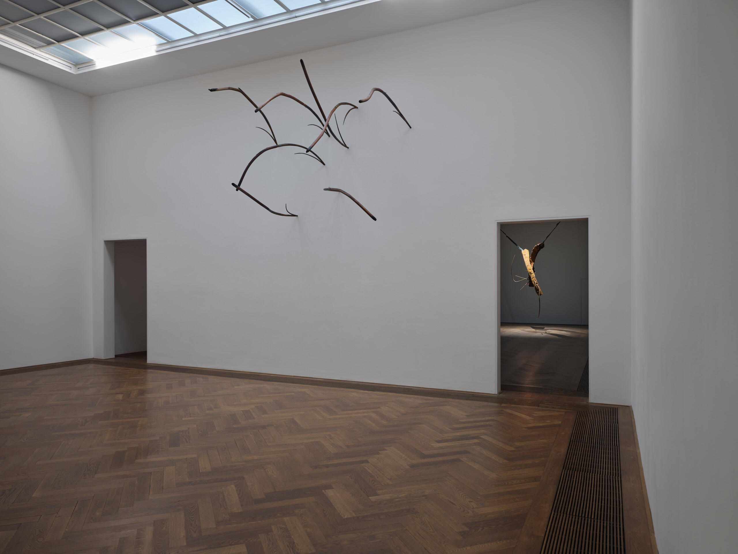 Als würde man über den Meeresgrund tauchen, bewegt man sich von Raum zu Raum, von Wrack zu Wrack. Sieht Harpunen, die wie Schilf im Wind tanzen und solche, die wie Dolche in der weissen Museumswand stecken. Schön anzusehen, wüsste man nicht: Das sind Waffen. All die von Dominique White geschaffenen lädierten Körper, die oxidierten Oberflächen, die fragilen Konstruktionen weisen darauf hin: Der Zerfall findet statt. Jetzt gerade. Doch Whites Skulpturen tragen das Gewicht des Zusammenbruchs mit Würde, symbolisieren Widerstand statt Endzeitstimmung – immerhin. Vorsichtig optimistisch geht’s in den ersten Stock zu Diambes «Bees beings beans».