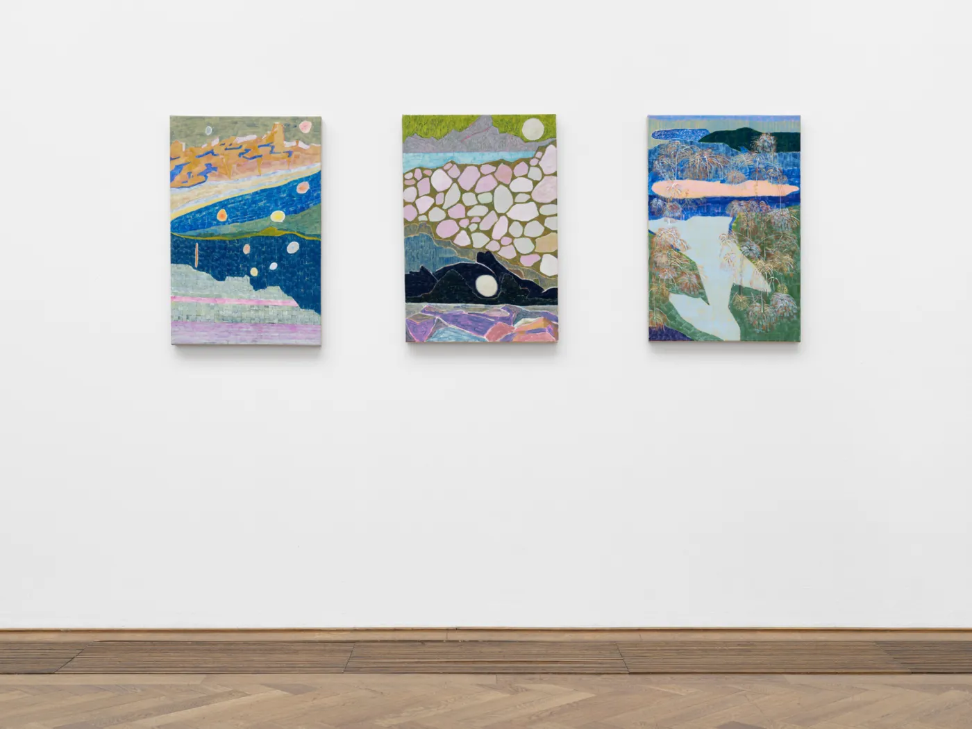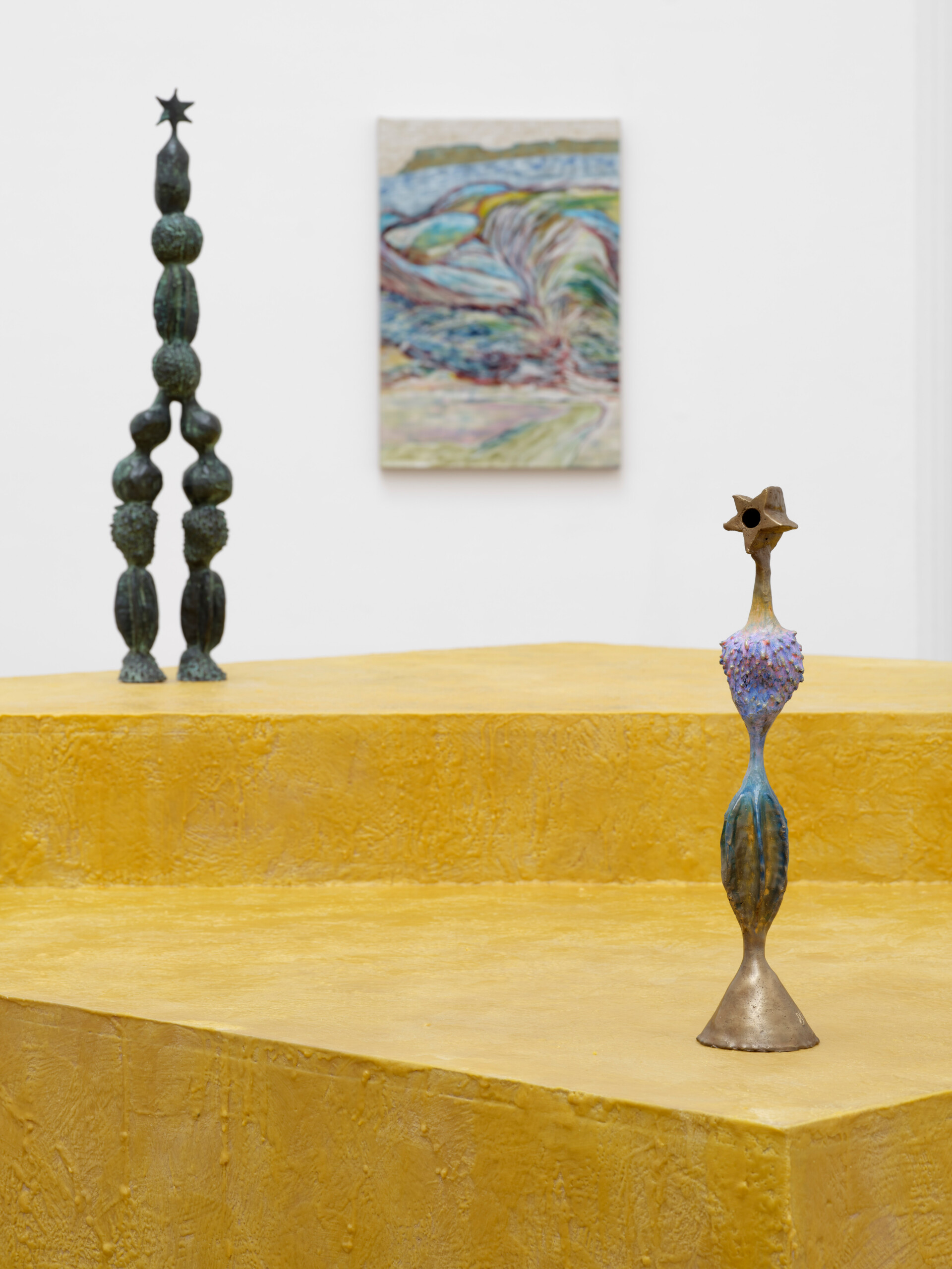 Hier duftet es angenehm nach Bienenwachs. Das Wachs umhüllt die Sockel, auf denen Diambes Skulpturen ruhen und auch die Sitzgelegenheiten in der Ausstellung. Ein Video zeigt, wie zwei mit Zuckersirup übergossene Bienenwachs-Skulpturen auf einem Feld von Bienen erobert werden. Das entsprechende Summen erfüllt den Raum aus mehreren Lautsprechern. Auch die Besuchenden bewegen sich zwischen den Arbeiten wie ein Schwarm, machen Fotos, begutachten die zart wirkenden Bronzefiguren, die bunten Landschafts-Gemälde. Wie bei Dominique White geht es auch hier um das, was entsteht, wenn sich Systeme neu formieren müssen. Eine wunderbare Anregung in Zeiten, die ein Umdenken erfordern.