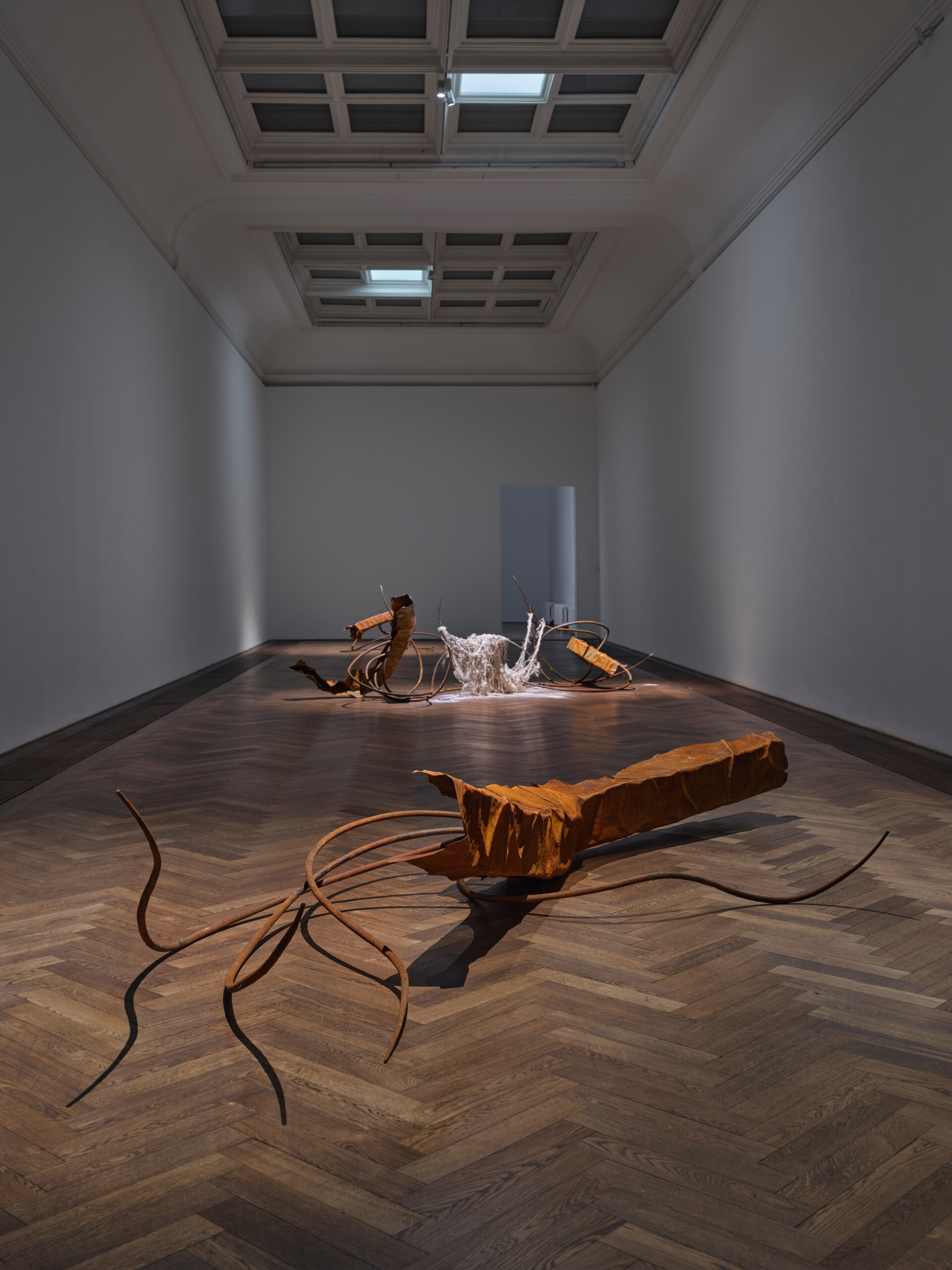 Es ist ruhig in der Kunsthalle. Das Licht in den Räumen im Parterre ist gedimmt. Am Boden liegen mächtige Eisen-Skulpturen, die an rostige Überreste von Schiffen erinnern. Der Raum wirkt beklemmend, macht einen zum Zeugen einer unbekannten Katastrophe. Bedrohlich auch der Titel der Ausstellung: «All Great Powers Collapse from the Centre». Es geht um organisierte Macht, um ausbeuterische Systeme und darum, dass die Menschen nichts aus der Geschichte lernen. Die britische Künstlerin Dominique White hat die Skulpturen eigens für die Ausstellung in Basel geschaffen.